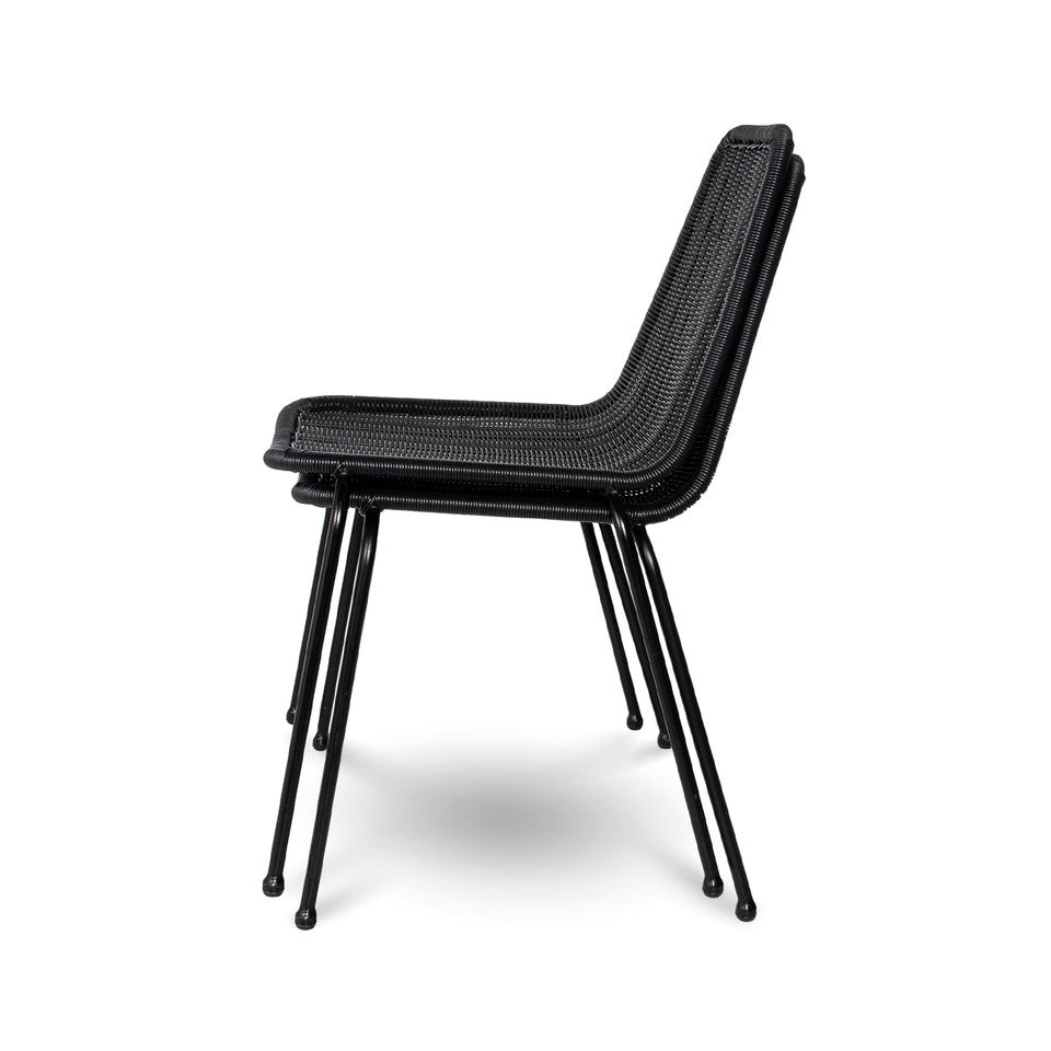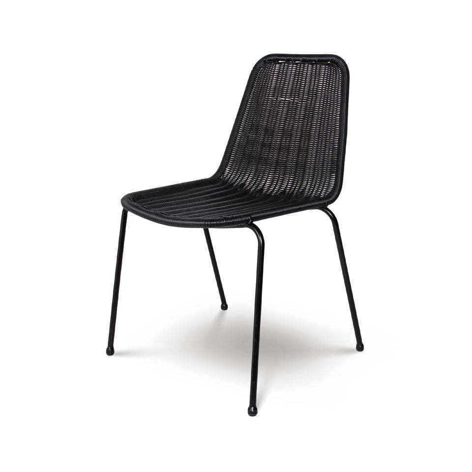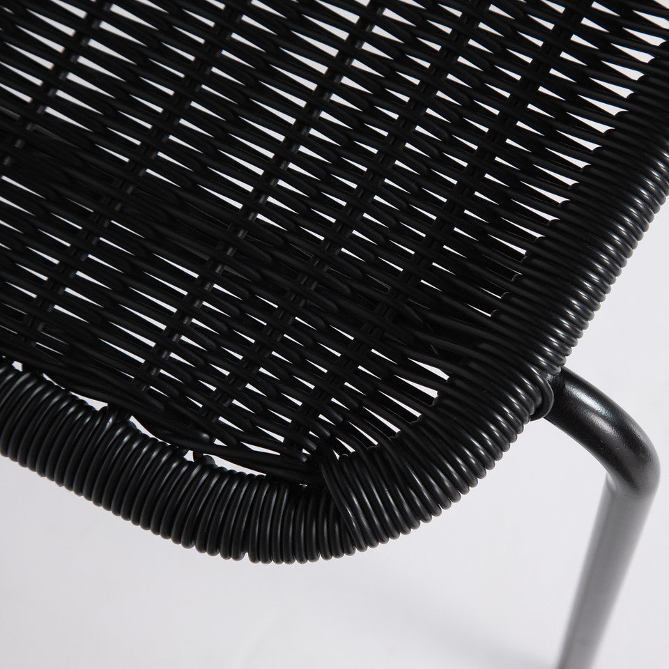 Crafted with woven, UV resistant polyresin wicker, this chair offers both durability and elegance. This indoor/outdoor dining chair features sleek and sturdy iron legs plus a comfy seat that hugs in all the right places. Designed with practicality in mind, these chairs can be easily stacked for convenient storage when not in use.
