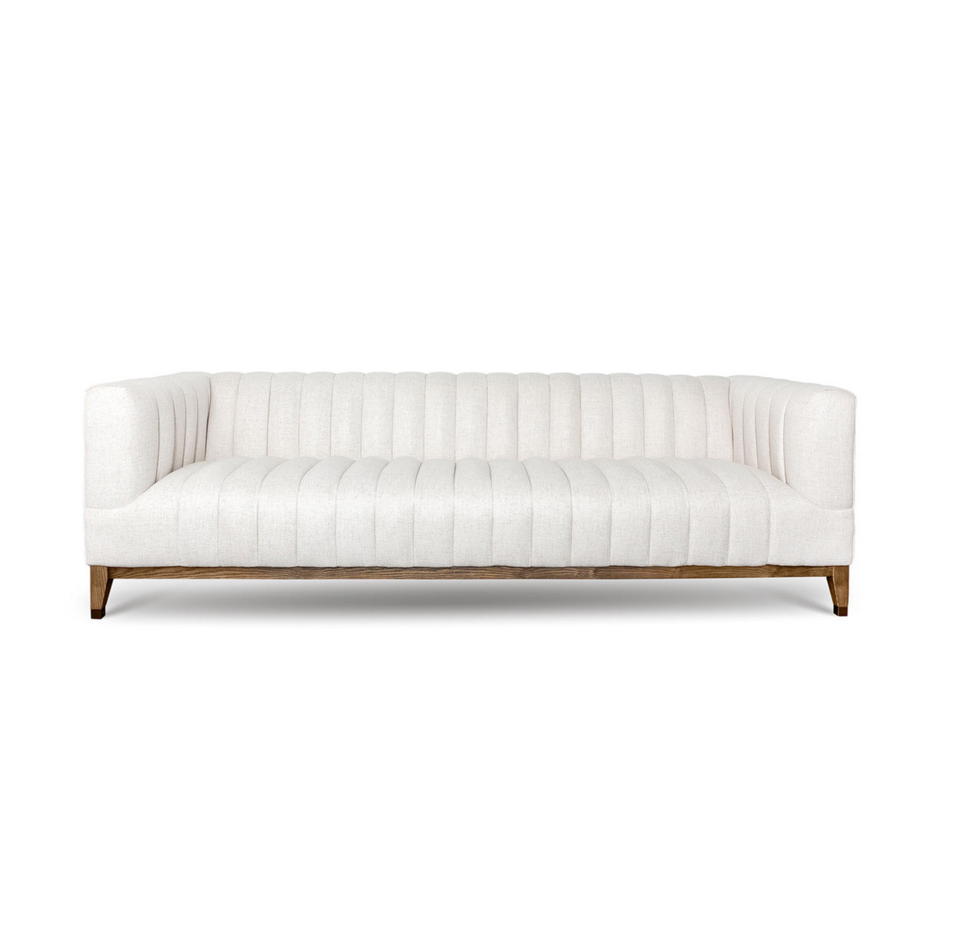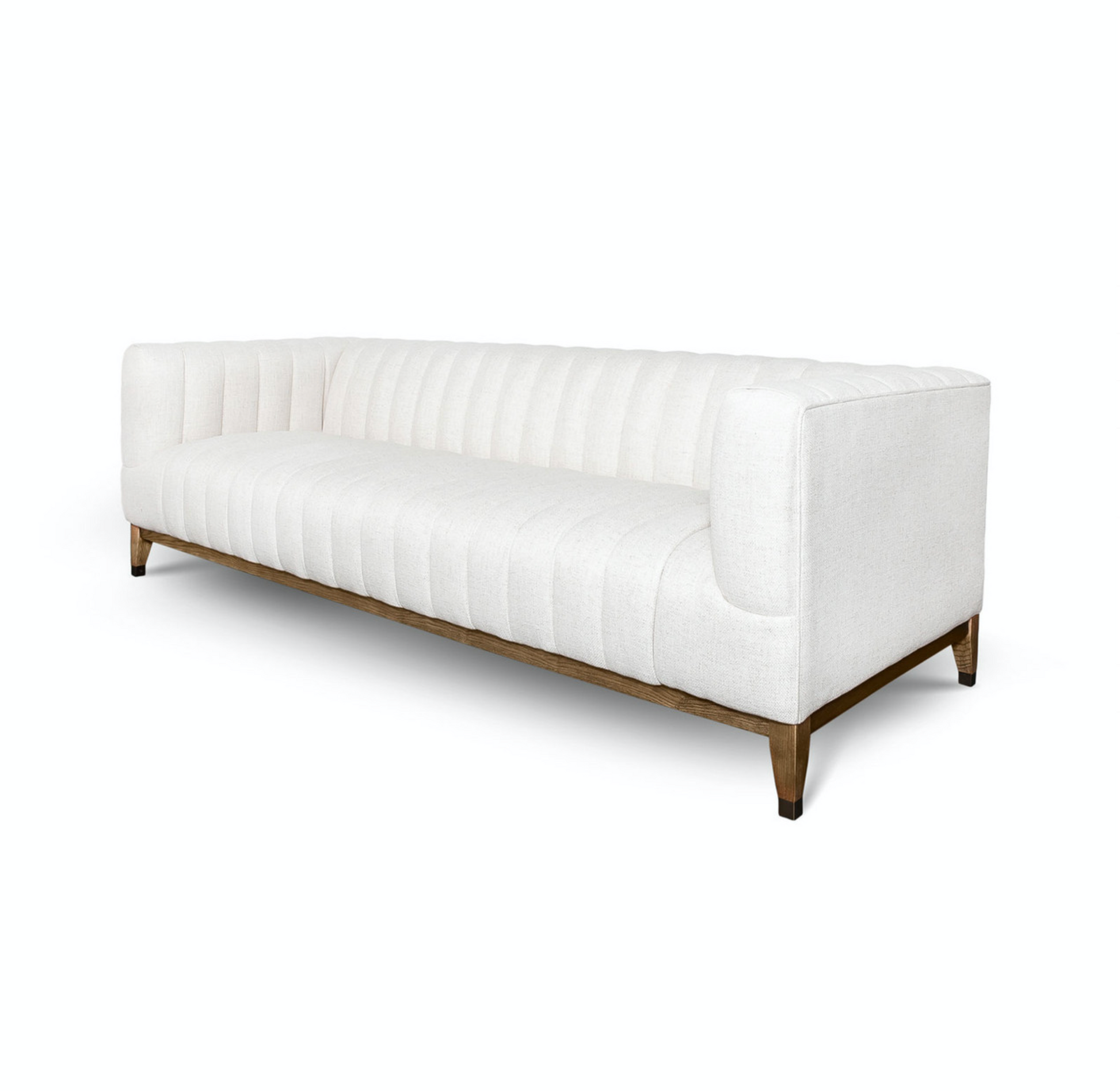 Our Elliot Sofa is a true show-stopper. You can't help but be drawn to its bold yet refined look. It's not just a sofa – it's furniture with attitude! Upholstered in a performance cream fabric, it's perfect for busy households with lots of traffic, pets or parties. The deep channels give its sleek profile added dimension while the driftwood base and gold foot detail gives this sofa an opulent finish.