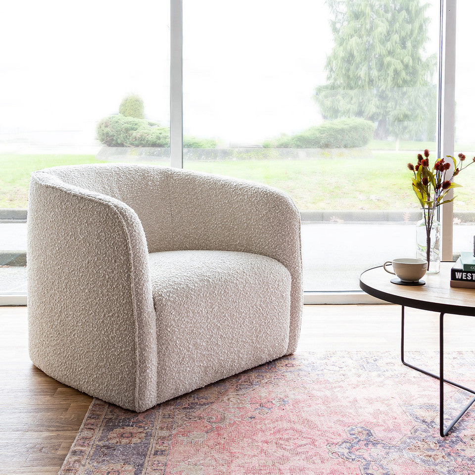 Crafted in Europe, this barrel chair features a hidden swivel base for sneaky swirls around the room. Each Evita Swivel Chair is upholstered in a luxe, boucle fabric that is OEKO-TEX® STANDARD 100 Certified. Fabrics that are certified by STANDARD 100 by OEKO-TEX® have undergone testing to ensure they do not contain any harmful substances that could compromise your health.