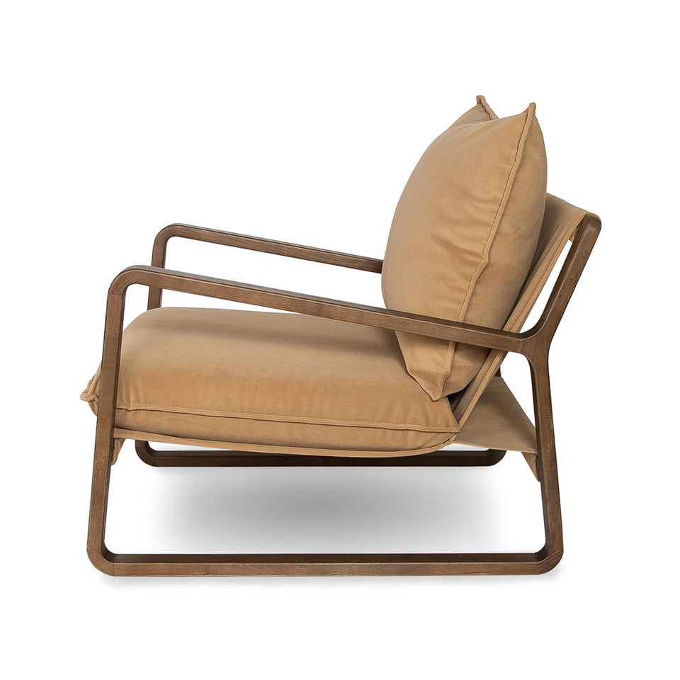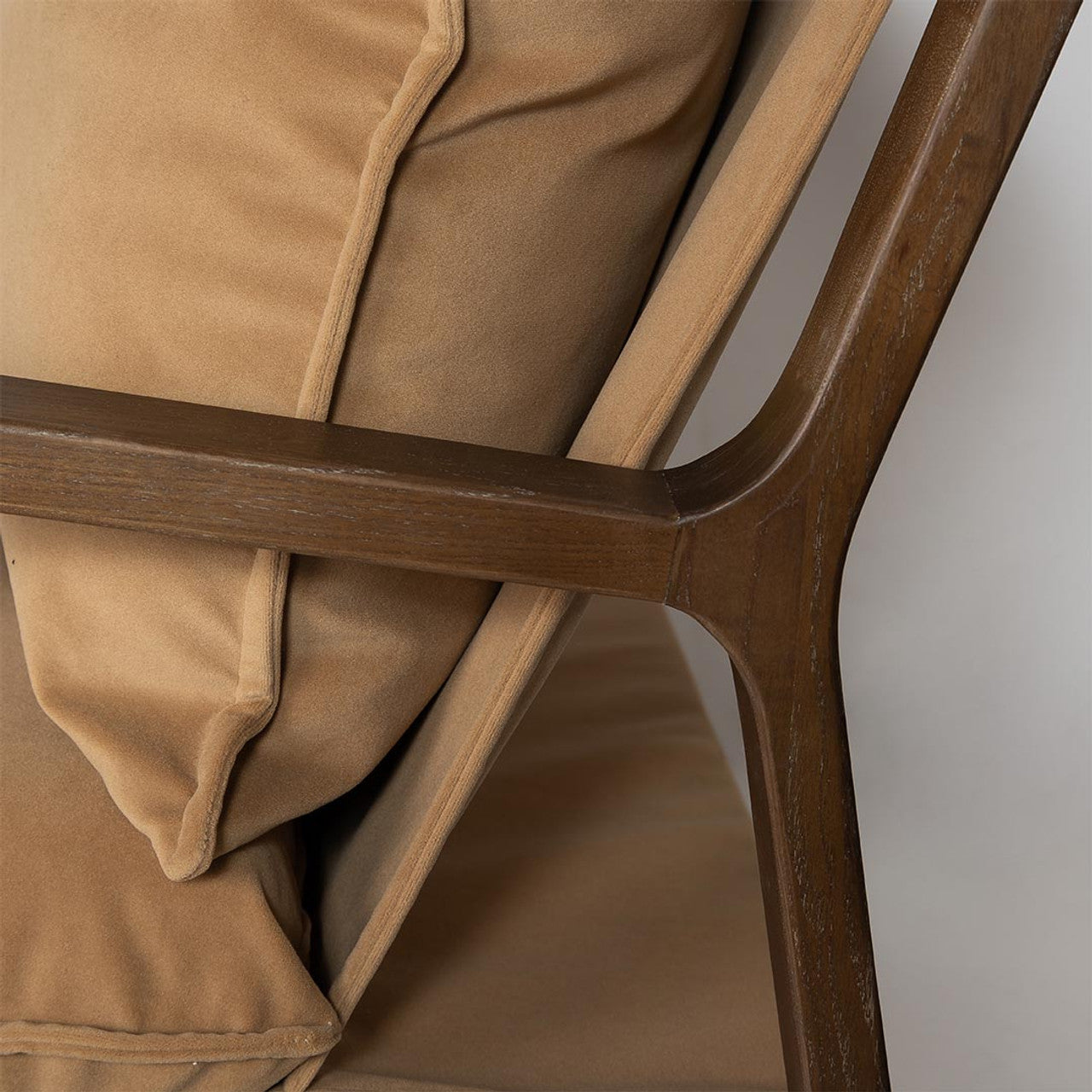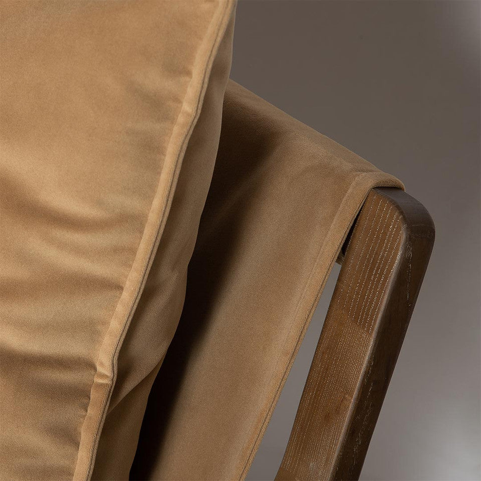 Cradled in a sleek wooden frame, this low-profile sling chair boasts generous cushions wrapped in sumptuous camel-coloured poly-velvet that whisper an invitation to unwind.