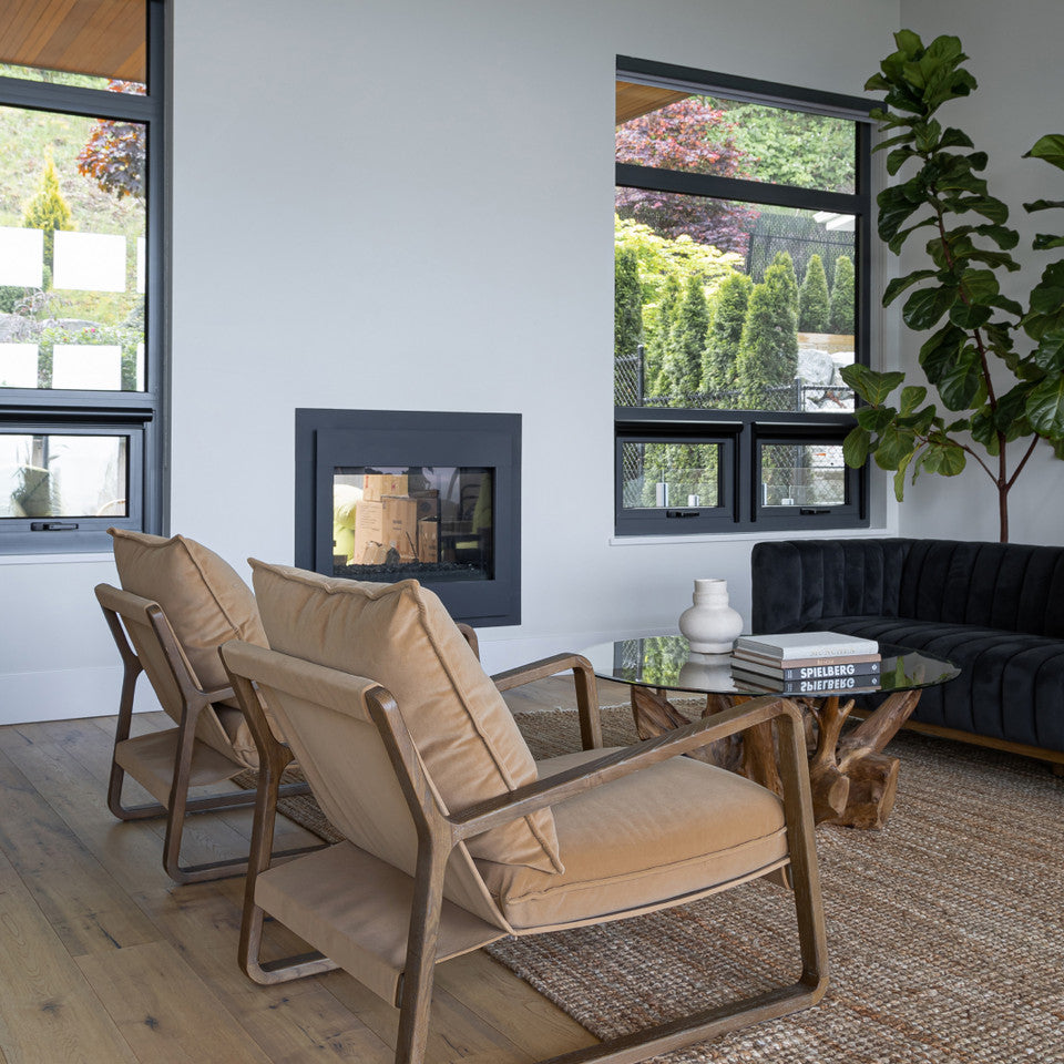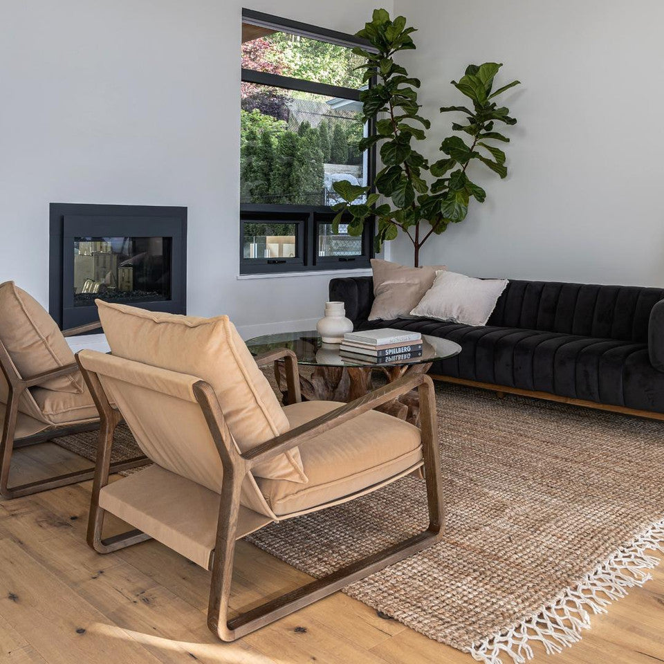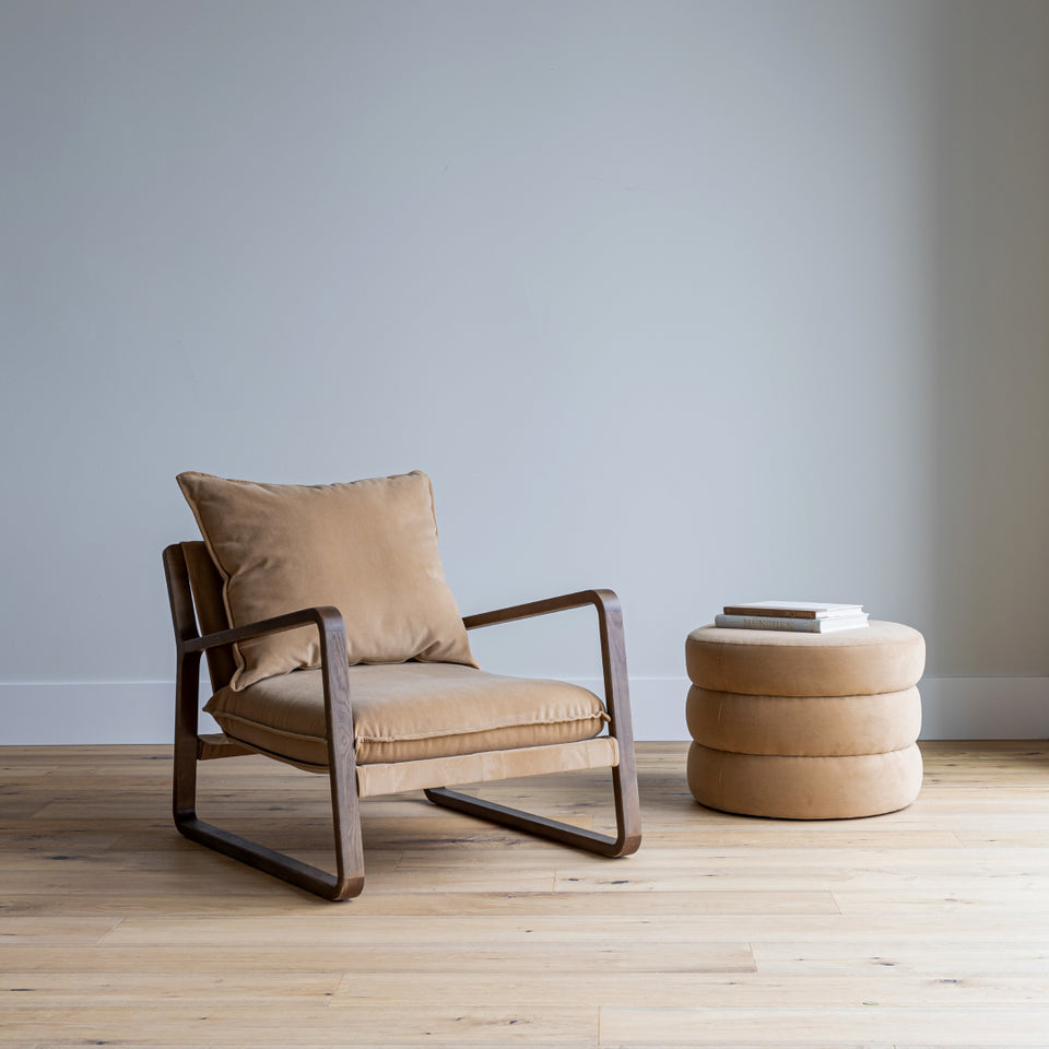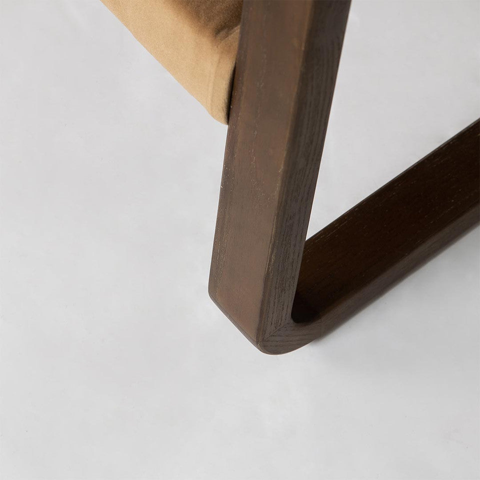 Cradled in a sleek wooden frame, this low-profile sling chair boasts generous cushions wrapped in sumptuous camel-coloured poly-velvet that whisper an invitation to unwind.
