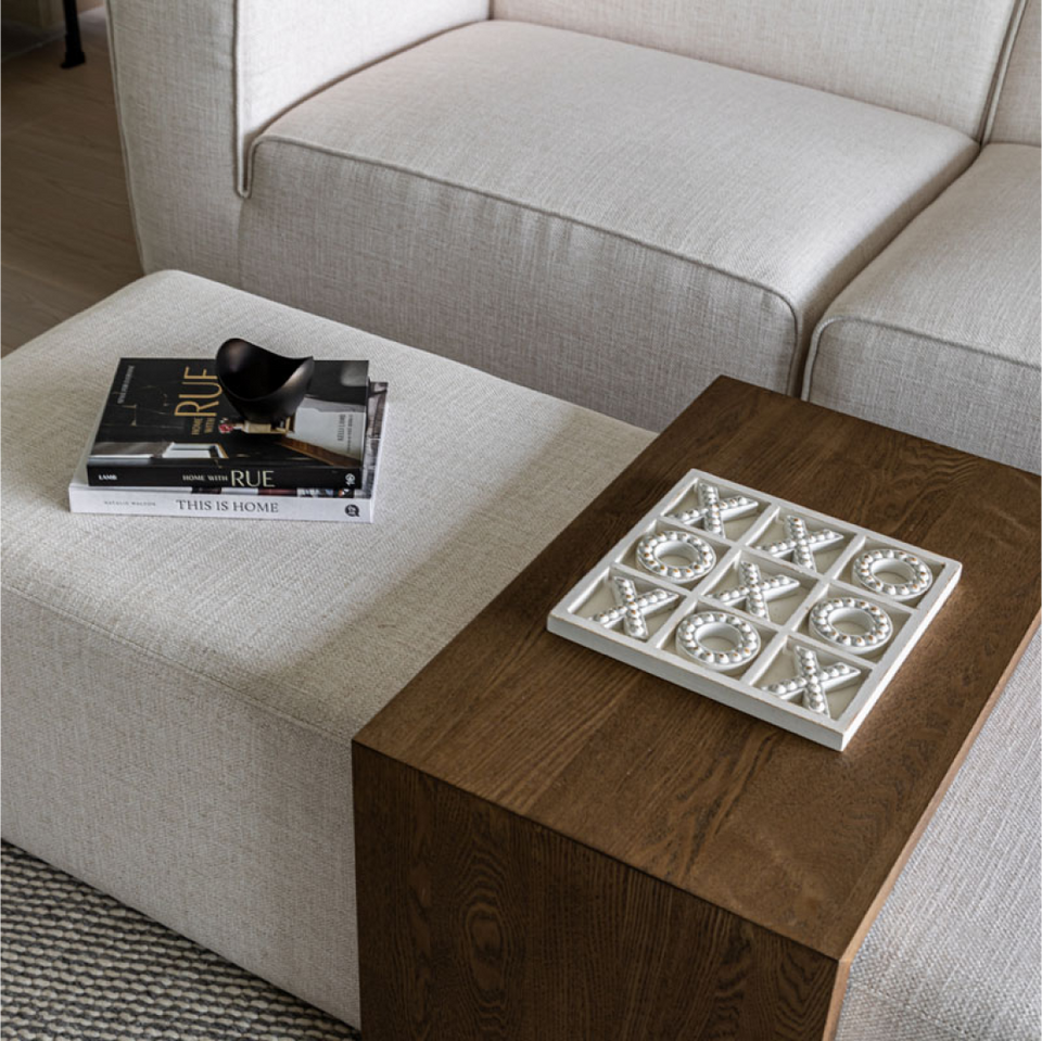 This minimalist ottoman and coffee table combo has hints of Art Deco design and re-imagined with modern styling. Upholstered in a gorgeous cream fabric, this rectangular ottoman comes with a dark wood waterfall table that slides over the top. Versatile and designed with contemporary appeal, this flexible piece can be used as extra seating, a coffee table or even at the end of a bed.