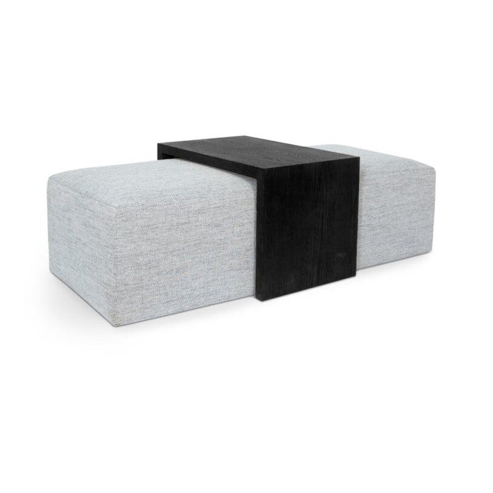 This contemporary ottoman features a minimalist aesthetic with subtle Art Deco influences, updated with modern touches. Upholstered in a luxurious salt and pepper performance-weave fabric, this rectangular ottoman comes with a black oak waterfall table that slides over the top.