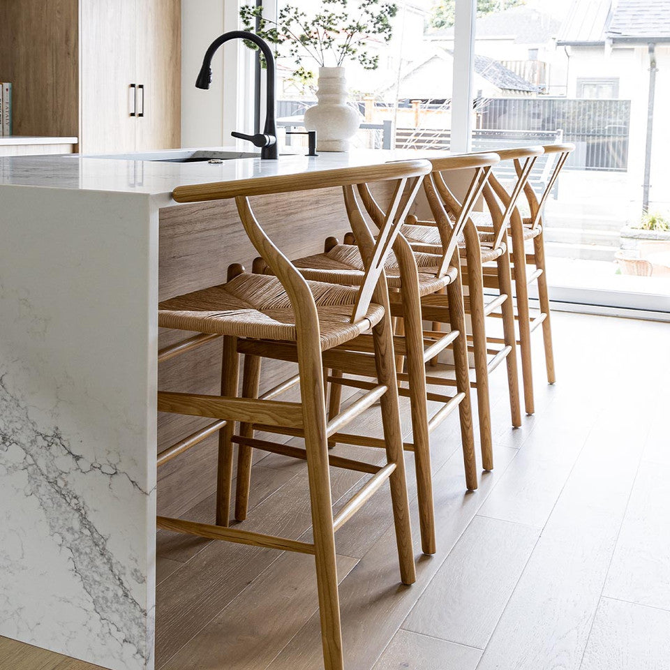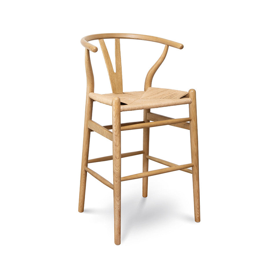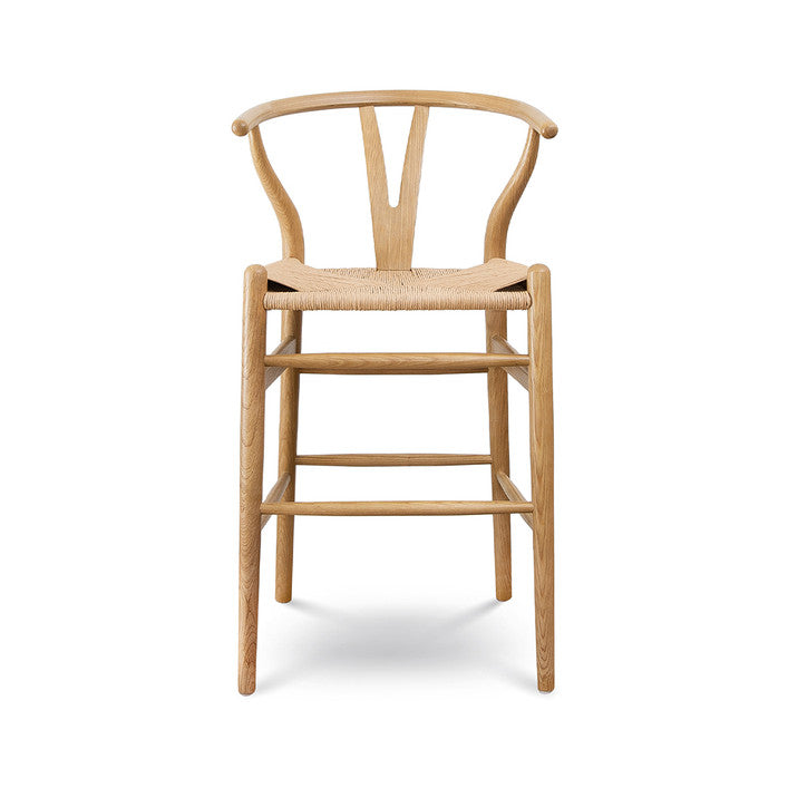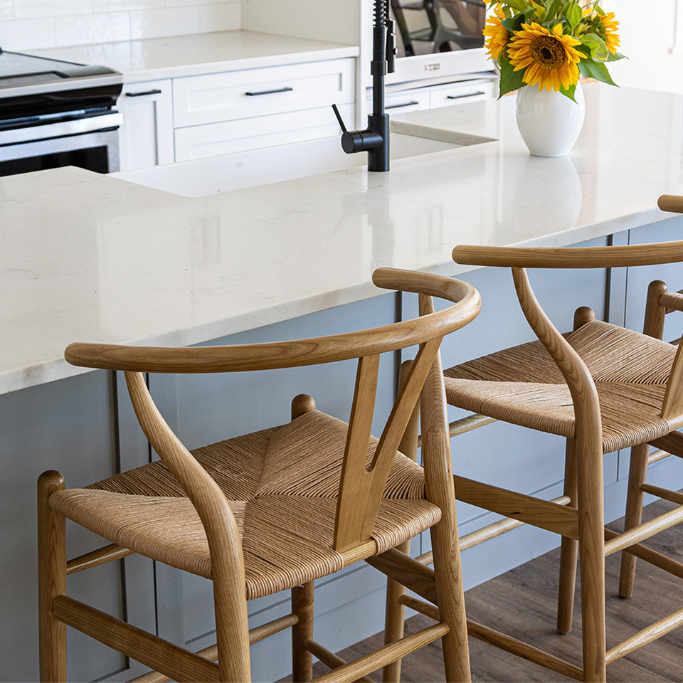 This piece is the epitome of natural simplicity. Inspired by the mid-mod 1950s Hans J Wegner wishbone chairs, these counter stools offer a minimalist aesthetic and airy feel. The Y-back design creates an organic vibe that will help this piece fit seamlessly into any space. The curving top rail and tapered legs are stunning details that elevate this piece to the next level. The natural paper rope seat is woven into perfect comfort, so you can sit back and relax in style.