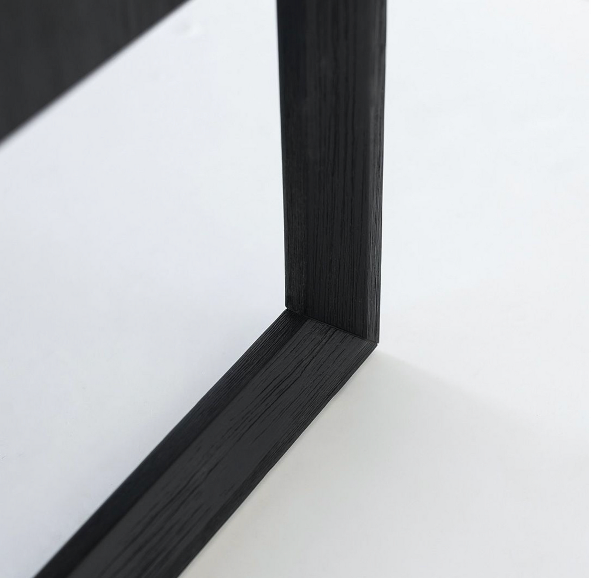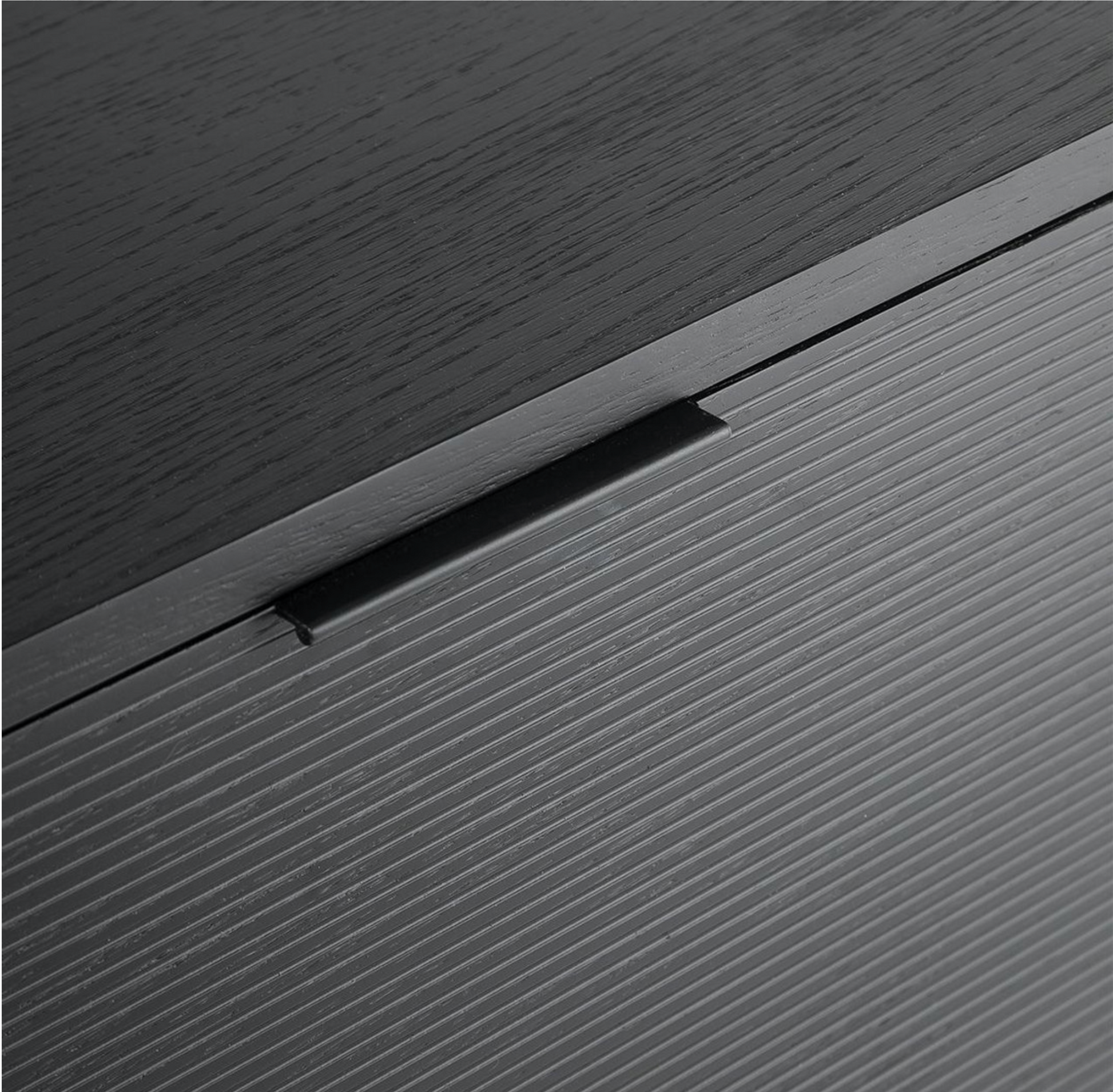 This stunner of a wood storage cabinet is finished with an ash veneer in matte black wood stain, and runner legs that add stylish detail. At 14” deep, this sleek minimalist 3-door sideboard was designed for larger spaces and condo living. The shallow depth makes it a perfect fit for dining rooms, living rooms, bedrooms and entryways.