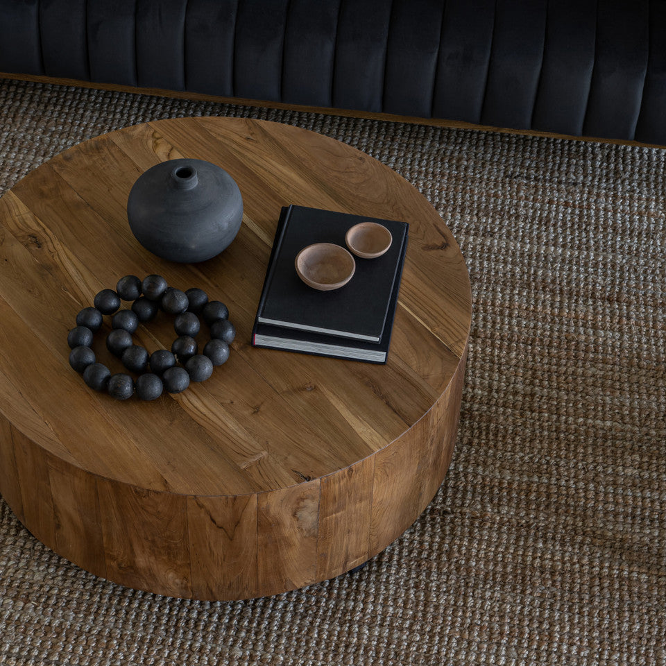 Introducing the Reza Round Coffee Table, where contemporary style gracefully intersects with traditional craftsmanship. This eye-catching 39-inch table is meticulously handcrafted from solid reclaimed teak, showcasing the beauty and uniqueness of its materials. Its design features sleek, inset black wood legs that provide a modern contrast, elevating the table into a striking centerpiece for any room.